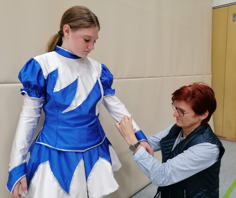 Zu den Vorbereitungen auf die Faschingssaison gehört auch, dass die Gardemädchen – wie hier Marie Merkl - zu ihren Auftritten in optimalem Outfit erscheinen. Dank der vorzüglichen Arbeit von Schneiderin Birgit Panzer ist das garantiert.