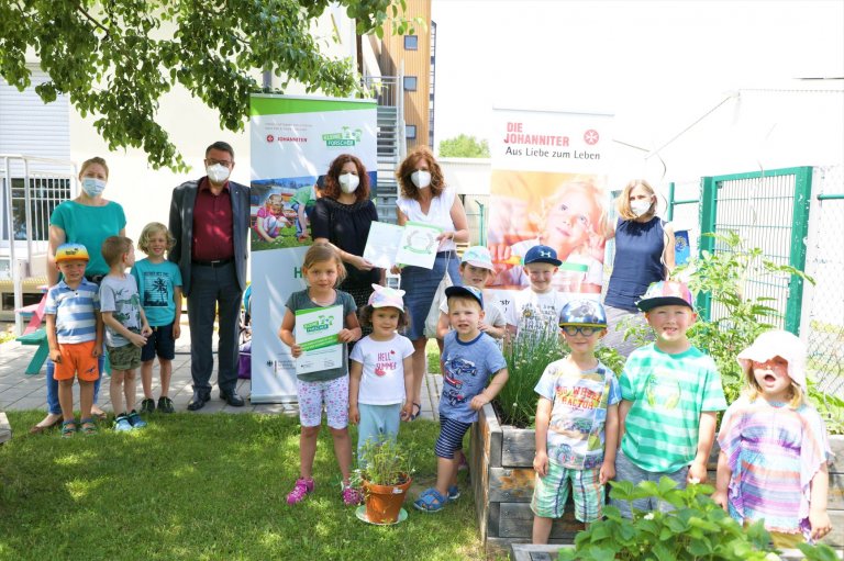 Das Zertifikat wird für kontinuierliches Engagement bei der Förderung frühkindlicher Bildung in den Bereichen Naturwissenschaften, Mathematik und Technik vergeben. Dieses Engagement haben auch die Erzieherinnen im Conrad-Kinderhaus der Johanniter gezeigt. So sind in den vergangenen Jahren verschiedene spannende Orte und Projekte entstanden. So zeigten die Kids ihren Gästen stolz ihren Barfußpfad, ihre Hochbeete und ihre Komposter. Jetzt konnten die Kinder aufgrund ihrer praktischen Erfahrung schon viel über das Wachstum von Tomaten, Erdbeeren oder auch Schnittlauch erzählen und berichteten ihren erwachsenen Gästen, wie der Kompost funktioniert.