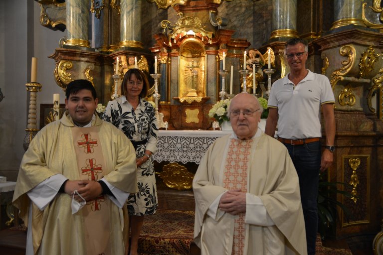 Zu Beginn der Messfeier war der Neupriester von Pfarrgemeindesprecherin Anita Falk begrüßt worden. Neben vielen anderen Pfarrangehörigen nahm auch Bürgermeister Hermann Falk an dem Gottesdienst teil. In den kommenden Wochen werden die Gläubigen noch öfter mit ihm die Hl. Messe feiern können, da er in der Urlaubszeit Stadtpfarrer Johann Hofmann in der Pfarreiengemeinschaft vertritt.