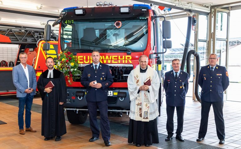 Nachdem es also offiziell einsatzbereit ist, durfte der kirchliche Segen nicht mehr fehlen. Stadtpfarrer Hofmann und Pfarrer Fischer nahmen die Segnung gemeinsam vor: „Nun ist das neue Fahrzeug zusätzlich zu seiner umfangreichen Ausrüstung auch mit dem kirchlichen Segen ausgestattet und kann zum Segen für die Menschen hier in der Region, in der Stadt und der Umgebung werden. Zum Symbol dafür, dass andere zum Helfen bereit sind, wo es nötig ist, und dass niemand allein gelassen wird in der Not. Es braucht Segen und die Gewissheit, dass Gott seine Hand über mich hält, wenn der Melder geht und ich zum Einsatz hinaus muss. Diesen Segen wollen wir heute zur Indienststellung dem LF 20 mit auf den Weg geben und es einweihen.“ Als letzten noch fehlenden Ausrüstungsgegenstand überreichte Pfarrer Fischer an Kommandant Jasinsky einen kleinen Schutzengel. „Für diesen wird sich gewiss noch ein Platz im neuen LF 20 finden.“