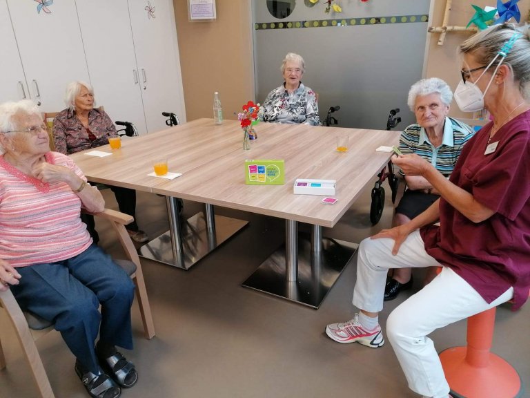 Gedächtnistraining wird groß geschrieben in der Solitären Tagespflege St. Barbara. Memory-Spiele haben daher ihren festen Platz im Programm. Bei den Gästen ist eines seit Kurzem der absolute Top-Favorit – das „Oberpfälzer Dialekt-Memo“. Nicht nur die Senior*innen sind davon begeistert, auch das Betreuungspersonal wie z.B. Gabi Riß (r.).