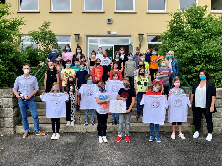 Bevor dieses aufgedruckt werden konnte, musste es erst einmal entworfen werden. Zu diesem Zweck waren die Mädchen und Jungen zu einem Malwettbewerb aufgerufen. Diesen gewannen Valentin Garban (jetzt 5. Klasse an der Realschule Amberg) und Noah Matthis mit ihren sehr detaillierten Bildern. Als Juroren fungierten die Schüler*innen und die Lehrkräfte. Michael Luber, Vater von Karolina aus der Klasse 3/4 und Art Director sowie Werbefachwirt, kombinierte die beiden Siegerbilder zu einem Schullogo, das der Schule noch fehlte. In dessen Zentrum findet sich das Wahrzeichen Hirschaus – der Monte Kaolino. Die Schul-T-Shirts sollen das Gemeinschaftsgefühl stärken und z.B. bei Landkreiswettbewerben schon von Weitem zeigen. „Wir sind Hirschauer!“ Studienrätin Hildegard Feyrer koordinierte die Erstbestellungen. Rektorin Birgit Härtl übergab den Kindern, die den Malwettbewerb gewonnen hatten, einen Eis-Gutschein von Francesco Donadio, dem Inhaber der Hirschauer Eisdiele. Michael Luber erhielt ebenfalls ein kleines Präsent für seine Zeit, Mühen und die Kreativität. Zum Abschluss ihrer Grundschulzeit erhielten jetzt die Viertklässler als Abschiedsgeschenk ein T-Shirt mit dem Schullogo. Die Lehrkräfte haben sich zwischenzeitlich auch bereits Schul-Polo-Shirst bestellt. Ab kommendem Schuljahr kann dann jedes Mitglied der Hirschauer Schulfamilie ein T-Shirt der Grund- und Mittelschule erwerben. Die Bestellungen werden gleich zu Schuljahresbeginn aufgenommen.