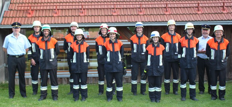 Trotz langer Corona-Pause bestanden die Feuerwehrmänner und –frauen ihre Leistungsprüfung mit Bravour. V. l.: KBI Martin Schmidt, 2. Kdt. Josef Giehrl, Florian Koller, Jakob Stauber, Kathrin Fischer, Wolfgang Fischer, Julia Giehrl, Heike Stein, Christina Pfab, Andreas Fischer, Benedikt Lederer, KBR Fredi Weiß und 1. Kdt. Ludwig Fischer.