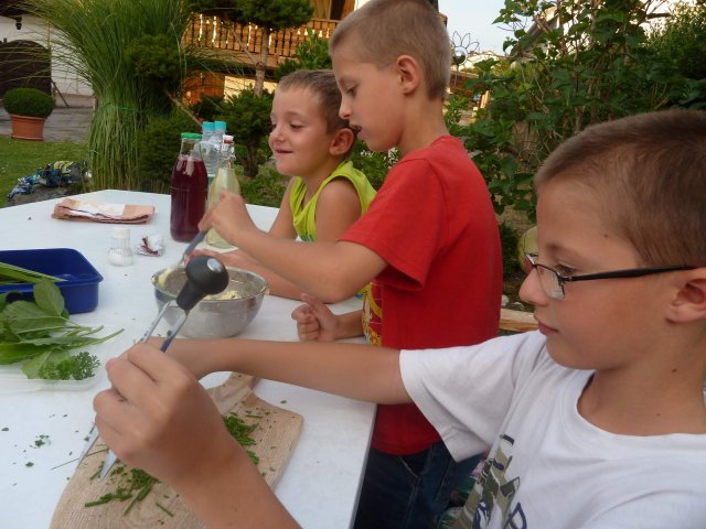 Bei den Vorbereitungen wurde den Montessori-Kindern schnell bewusst, dass Wildkräuter den Speiseplan bereichern und es kinderleicht ist, ein Picknick daraus zuzubereiten. Aus den mitgebrachten Kräutern wurde Kräuterquark und -butter gemacht. Mit Feuereifer waren die Kinder dabei, die verschiedenen Aromen der Kräuter zu probieren und kennenzulernen, bevor alles klein geschnitten wurde. Interessant war, dass es den "Lotos-Effekt" nicht nur bei der Seerose gibt. Auch bei den runden Blättern der Kapuzinerkresse perlte das Wasser ab. Ihre leuchtend orange-roten Blüten gaben zusammen mit den Ringelblumenblüten schöne Farbtupfer im Kräuterquark und der -butter. Eine willkommene Abkühlung an diesem heißen Sommertag brachte die Johannisbeeren-Holunderblütenlimonade mit Blüteneiswürfel.