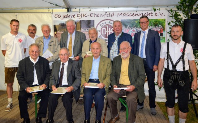 Zusammenhalt und persönliches Engagement waren auch die Worte, die beim Festabend am Samstag, von den Rednern am häufigsten zu hören waren. Vorstand Stefan Kummer ehrte 11 Mitglieder für 25 Jahre, 17 Personen für 40 Jahre und 29 Personen, davon 8 Gründungsmitglieder, für 50 Jahre Treue zur DJK. Zusammen mit Rupert Aigner vom DJK Diözesanverband Regensburg, Siegmund Balk vom DJK Kreisverband Weiden und Bürgermeister Hermann Falk würdigte der Vorstand dann die Vereinsarbeit von Edith Dorner, Fritz Dietl, Brigitte Gnan, Thomas Gnan, Josef Hüttner, Franz Kummer, Stefan Kummer, Georg Kustner, Reinhard Rumpler und Hermann Schlosser mit dem Bronzenen Ehrenabzeichen und von Helmut Falk und Hans Manthey mit dem Silbernen Ehrenabzeichen der DJK. Eine besondere Würdigung ihrer herausragenden, jahrelangen Tätigkeit erfuhren Hans Falk, Richard Falk, Hans Kummer und Rudolf Süßer. Sie sind ab sofort Ehrenmitglieder des Vereins. Da auch 11 ehemalige und aktuelle Trainer beim Festabend dabei waren, gab es nach dem offiziellen Teil noch viel zu erzählen, im Festzelt am Gemeinschaftshaus.