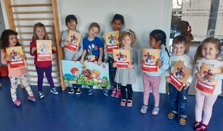 Die Kinder des Conrad-Kinderhauses der Johanniter, die am Englischkurs teilgenommen haben, präsentieren ihre Zertifikate.