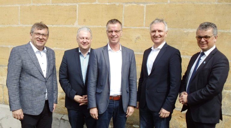 Händeschütteln im Akkord war für Bürgermeister Hermann Falk (Mitte) am Montag anlässlich seines 60. Geburtstags von früh bis spät angesagt. Zu den Gratulanten zählten auch v. l.: Bürgermeister Peter Braun (Kreisvors. By-Gemeindetag) und Landrat Richard Reisinger sowie v. r. Bürgermeister Martin Birner (Bezirksvors. By-Gemeindetag) und MdL Dr. Harald Schwartz.